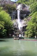 沿著石階,一個(gè)峰回路轉(zhuǎn)就到了龍吟潭邊,抬頭就會(huì)看到瀑布從90米高的懸崖上瀉入龍吟潭。站在壩上,撲面迎來一股涼爽的水汽。龍吟潭底建有水底龍宮,供人游覽,游玩龍宮出來后就坐小木船入洞游覽勝景。看了瀑布底下的5個(gè)小洞,船就進(jìn)入冬暖夏涼的龍游洞,一到洞內(nèi)碼頭,就看到洞內(nèi)的巨大洞窟,不看路標(biāo)說不定還會(huì)繞暈?zāi)?,游了水簾洞,盤龍瀑就進(jìn)入臥龍?zhí)?,靠著巖壁入洞中,盤繞上有33米高的圓壁樓梯就是懸空洞,從梯頭拍洞景,往下拍像玫瑰花,向前拍像洞中長廊,洞中倆旁洞室相連,有人防洞,會(huì)議廳,餐廳,廁所,廚房和洞宇文化宣傳窗。